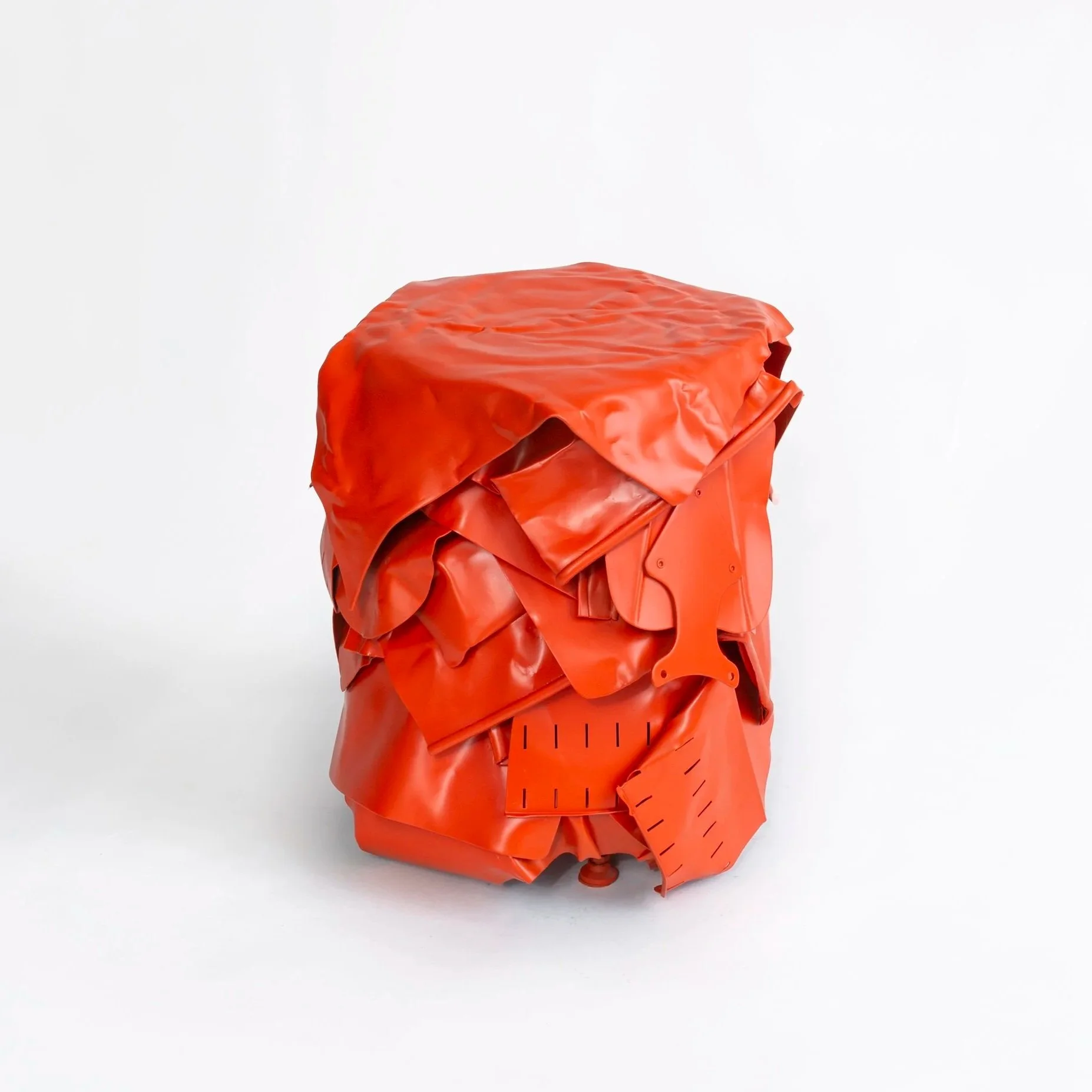 Crushed Orange with Church Fan by Hannah Vaughan, 2022. Scrap metal, hydraulic press and sledge hammer, 16" x 18" tall. Photo by Sol Erez.