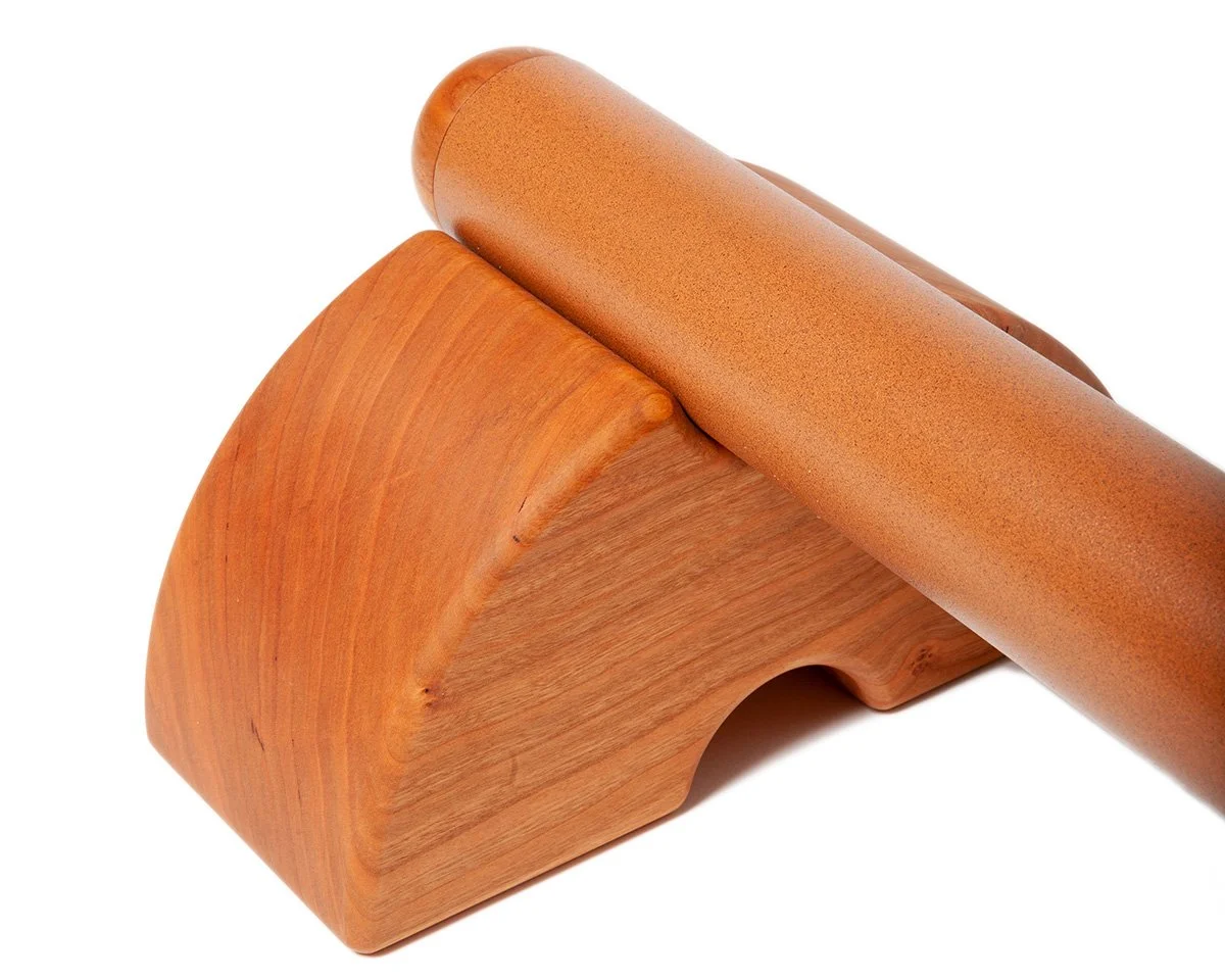 Ping Balance Rail (detail) by Wu Hanyen, 2018. Cherry, natural rubber, aluminum, woodturning, woodworking, metal working, 9" x 5½" x 48".
