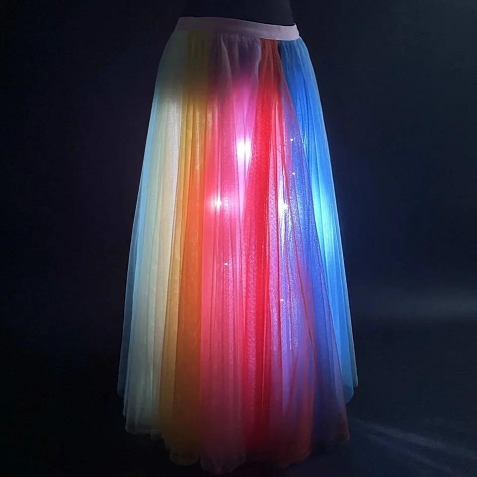 Rainbow Sensor Skirt by Lara Henderson, 2024. Flora microcontroller, color sensor, neopixel LEDs, battery, rainbow tulle skirt, 20" x 32".