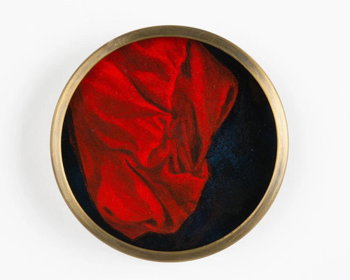 Drapery Miniature Study by Jessica Calderwood, 2019. Enamel, copper, brass, stencils, underglaze pencil, metal spinning, 4" x 4" x 1".