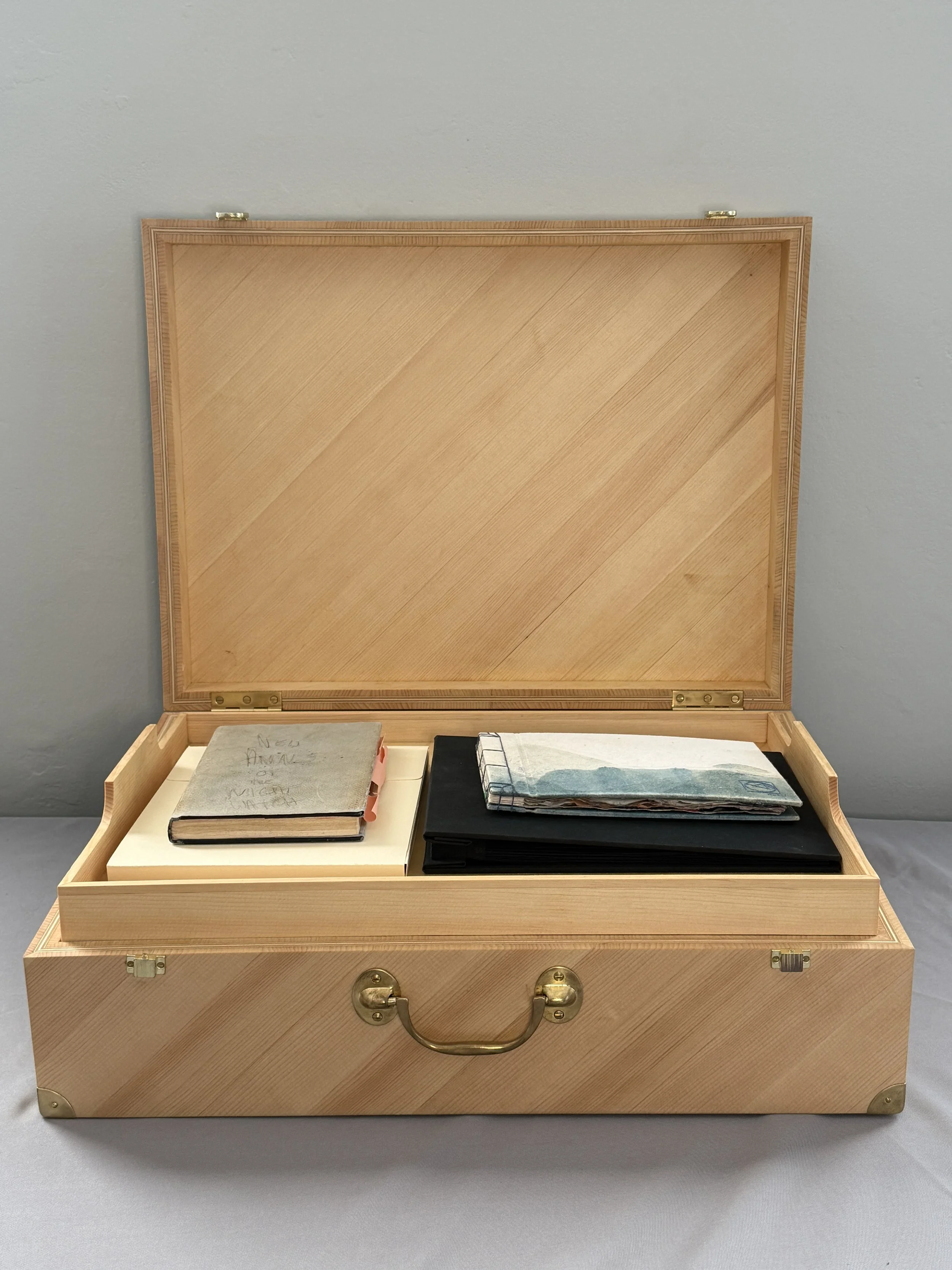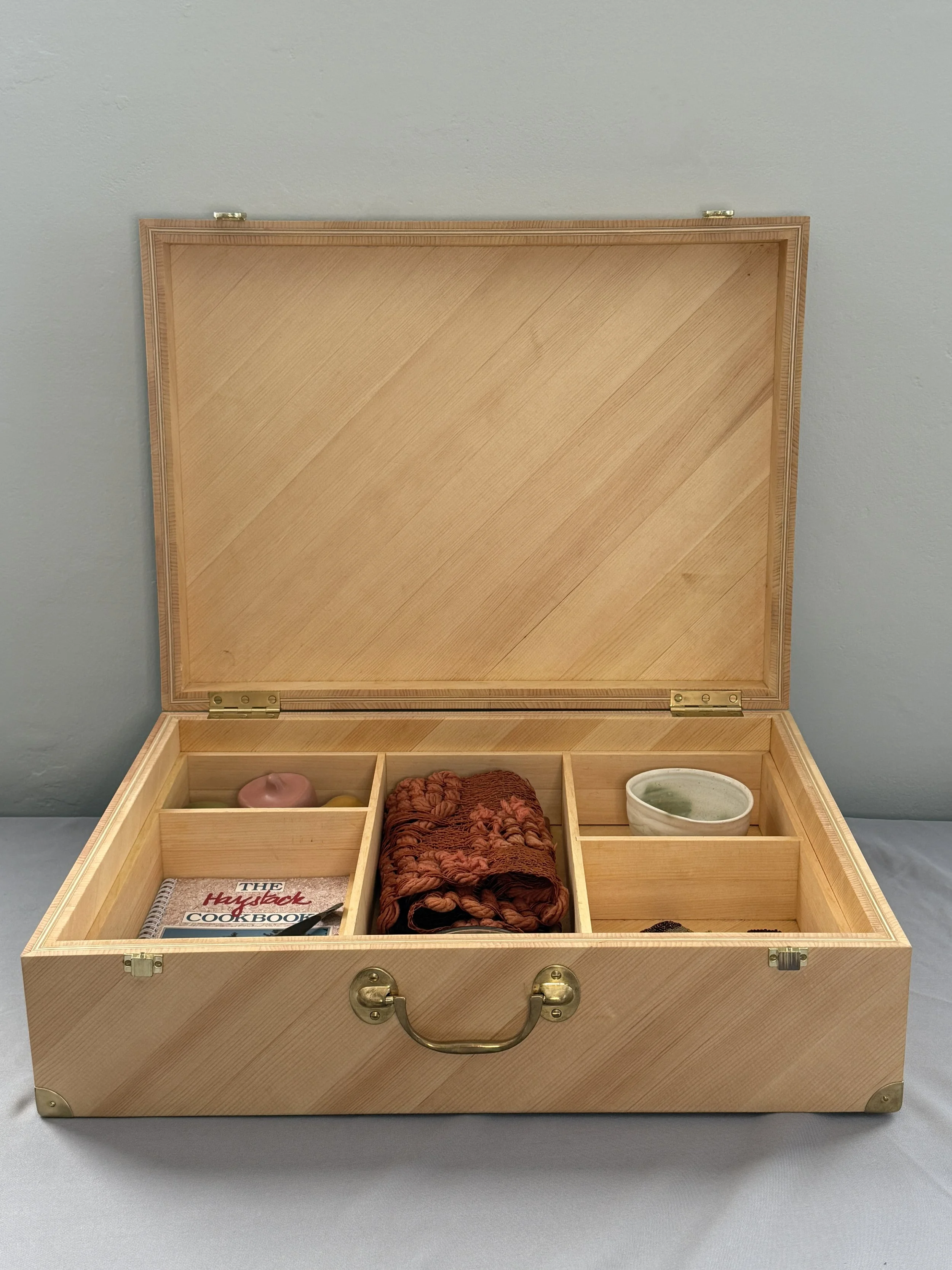 The Box itself was created in about two weeks’ time in the Wood studio by Brad Willis, a Studio Coordinator at Haystack since 2014. The Box was made from resawn pine using the table saw bandsaw jointer and planer. The veneers were glued together diagonally and laminated on a substrate using the vacuum bag. The tray and dividers inside were made using the same materials. Brad shares, “The prompt for the design was to reference the architecture of the School. I didn't want to make it too literal, so I mimicked the campus buildings’ diagonal sheathing using pine wood, and constructed it with mitered corners and minimal fixtures.” He continues, “I fit the dividers in the body of the Box without any fasteners or glue. Each piece has its own space for now, but if the objects change or the idea changes, so can the space.” How fitting that the Box evokes the ethos of our studio spaces.